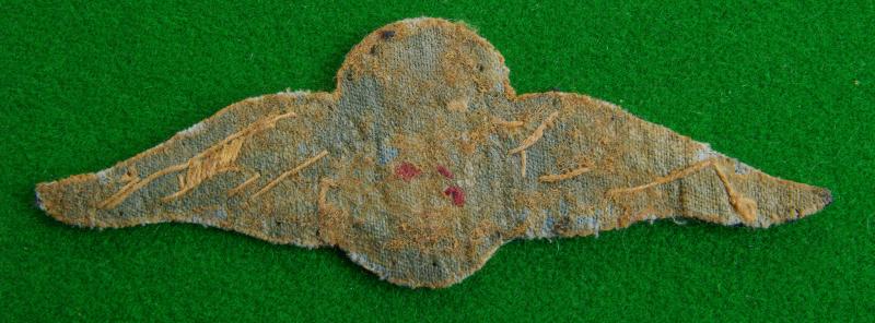Pair of king's crown embroidered pilot's qualification wings. A shield bearing the Arms of South Africa embroidered in various colours within a laurel wreath surmounted by a red inset king's crown and flanked by a pair of oatmeal coloured wings on a shaped black backing.
