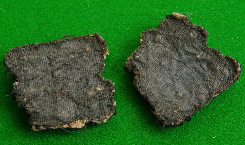 Pair of early pattern officers gold bullion wire collar badges. The Paschal Lamb upon a torse holding the silver wired swallow-tailed banner embroidered with the red cross.