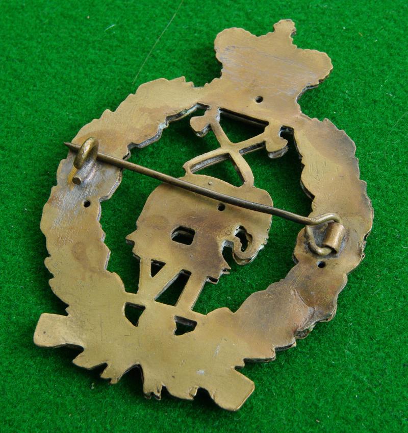 Very scare Victorian officers brass headdress badge with original brooch pin fitting to the reverse worn by the Fourth Madras Pioneers. A pair of crossed axes the elephant and roman numeral, "IV" to the centre of a wreath of laurel bearing honour scrolls, two of these unusually remain blank, and the title scroll, "Madras Pioneers" all surmounted by the Victorian crown upon the main honour, " Assaye"{Approx 7 cms high}