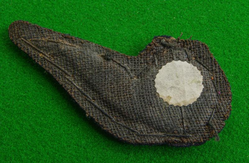 WW II embroidered and padded Flight-Engineer's qualification wing. An oatmeal-coloured half-wing with the letter, "E" and the "RCAF" monogram within a brown laurel wreath surmounted by the red inset king's crown on a shaped black backing with old original price label to the reverse.