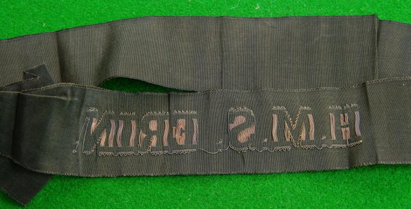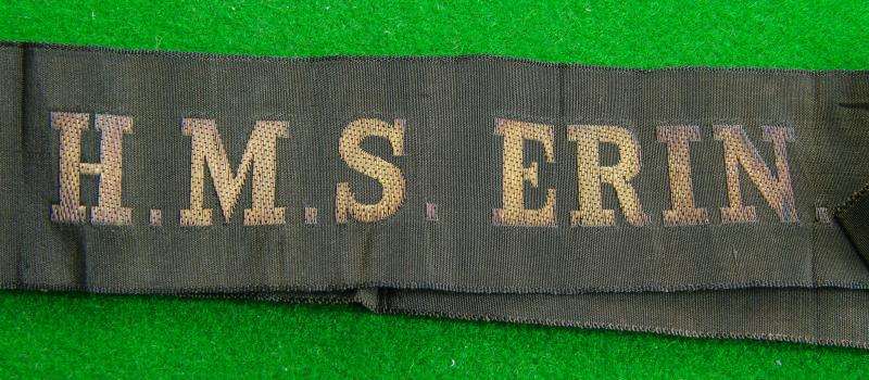 WW I gold wire embroidered full length with original bow Naval cap tally,"H.M.S. Erin". The "Erin was a dreadnought battleship originally built for the Ottoman Navy, but when war was declared in August 1914 Winston Churchill as First Lord of the Admiralty decided to keep the ship in British hands lest she fell into the hands of Germany or her allies.