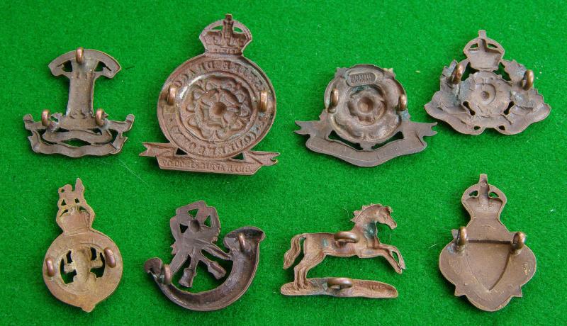 Group of eight officers bronze single service dress collar badges. Derbyshire,Glasgow,Leicester, Lancashire.Northampton,Sussex,Sherwoods.and Yorkshire.