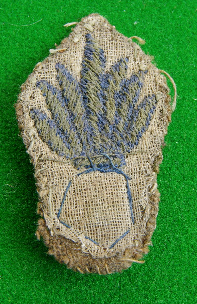 Scarce WW I embroidered sleeve qualification badge worn by Infantry and Royal Artillery operatives of Trench Mortars. A blue embroidered fused grenade.