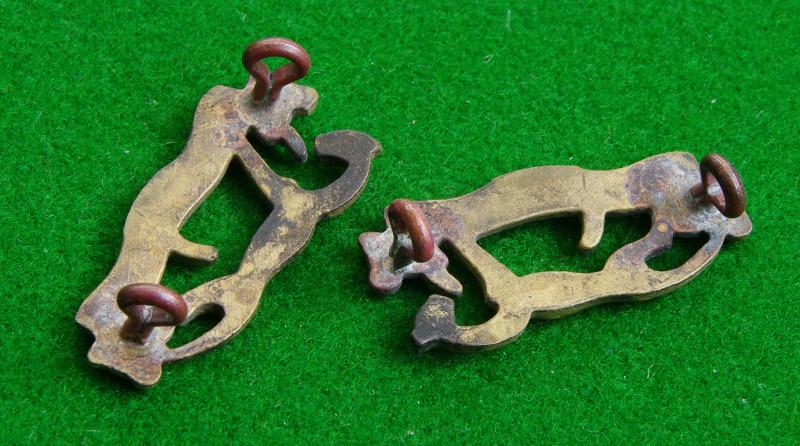 Pair of small brass collar badges. The skeletal White Horse of Uffington upon a furled blank scroll.