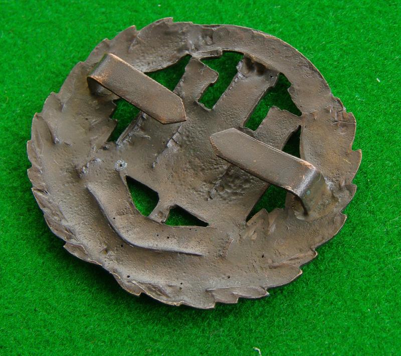 Scarce officers bronze service dress cap badge with two blades to the reverse worn by the 4th, Territorial Battalion Northamptonshire Regiment. The castle above the South Africa honour scroll surmounted by the title, " 4th.Battalion" within a wreath of laurel that carries the title, "Northamptonshire"