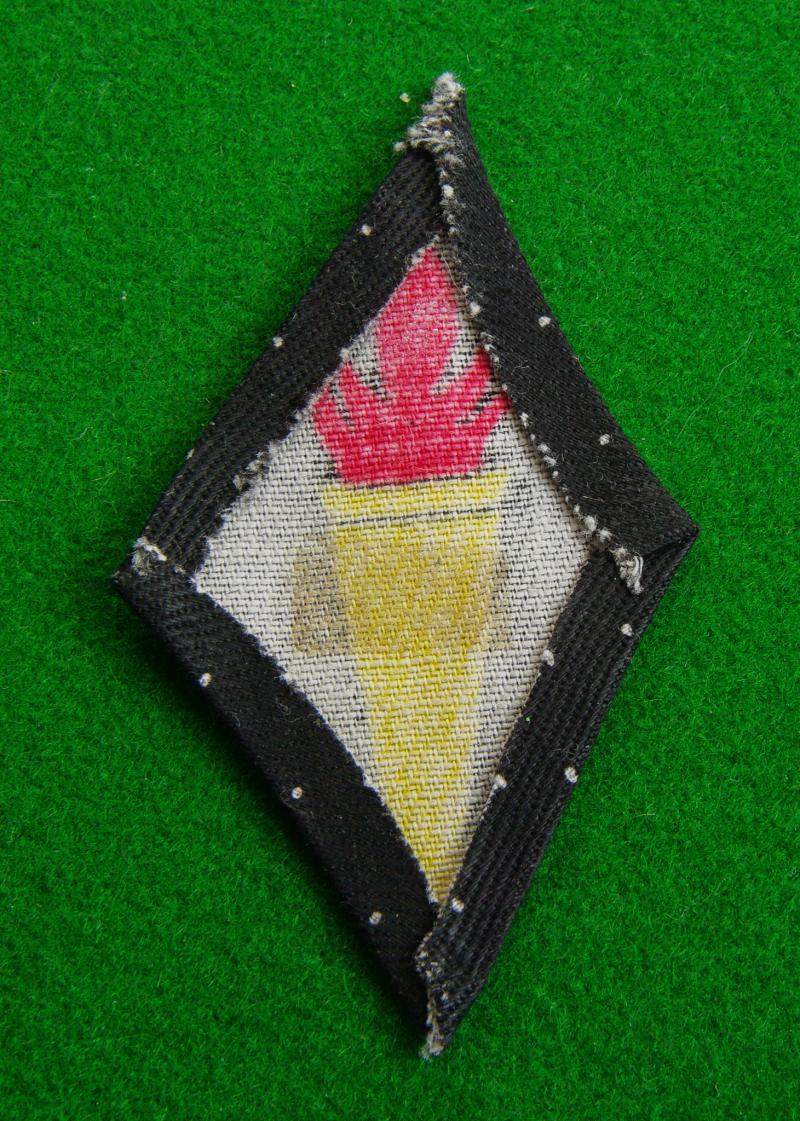WW II printed example of the yellow torch with red flames on a black diamond shaped backing.