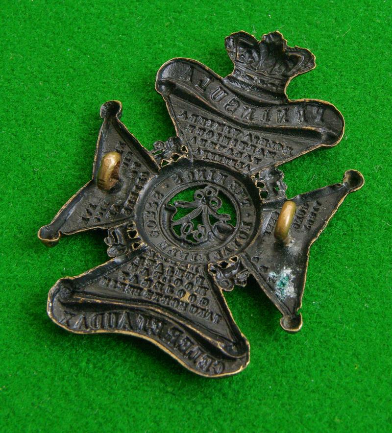 Victorian black-brass P / T glengarry badge with two loops to the reverse. The number, "60" within the strings of a bugle horn to the voided centre of a circlet bearing the title, on a maltese cross with battle honours to each arm above the furled motto scroll and surmounted by the crown upon the main honour, " Peninsula"