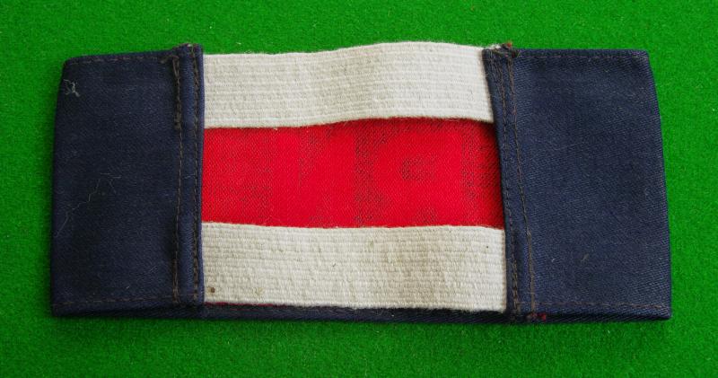 Scarce WW II printed Dark blue armband bearing the letters " R N" with elastic fitting to the reverse. worn by members of the Royal Observer Corps serving on non-Royal Navy vessels as Aircraft Identifiers for the Normandy Landings.