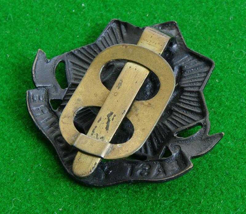 Black-brass cap badge with slider fitting to the reverse still retaining its original fixing clip. The Yorkshire Rose within a laurel wreath on a multi-rayed star above the furled title scroll, "East Yorkshire". Worn by the 5th. {Cyclist} Battalion East Yorkshire Regiment.