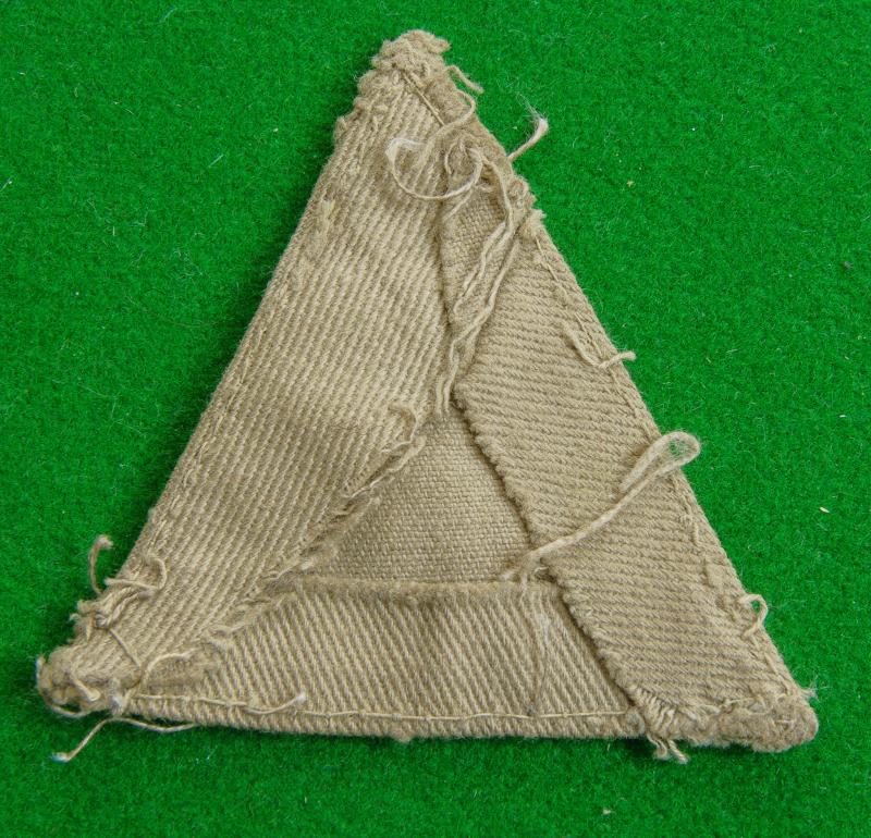 Scarce WW II printed example of the White Horse of Kent on a blue triangle still affixed to a section of pale tropical k.d material. Worn by the 1st. Battalion Royal West Kent Regiment