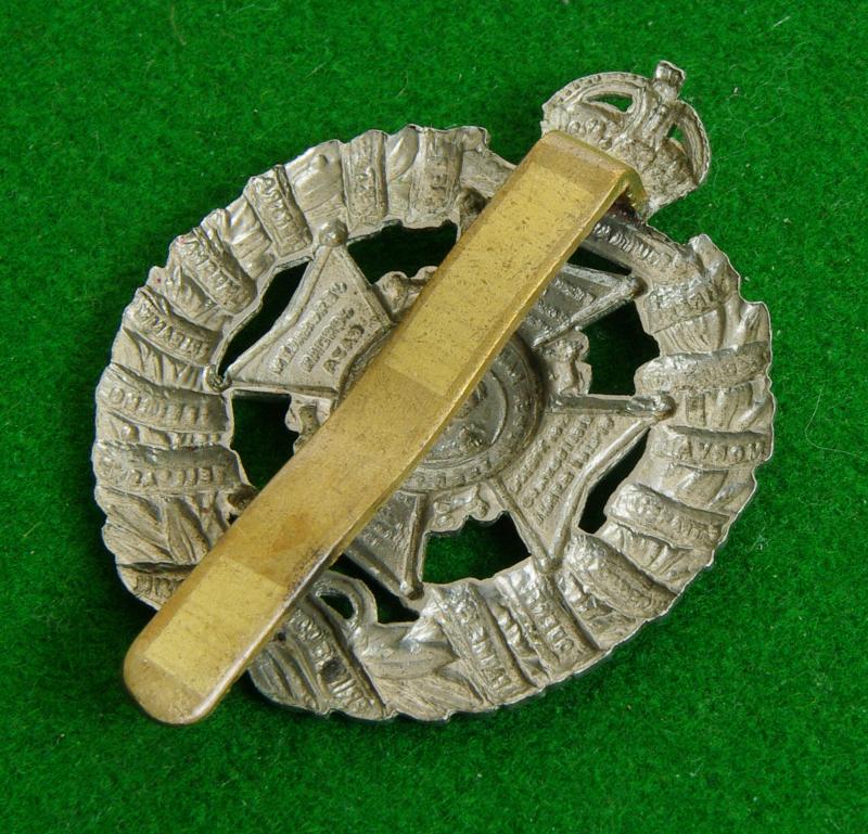 Scarce white metal king's crown cap badge with slider fitting to the reverse. A crowned bugle horn to the centre of a circlet bearing, " Tower Hamlets Rifles the Rifle Brigade" on a maltese cross within a wreath of laurel both covered with numerous battle honour and surmounted by the crown upon a tablet " South Africa 1900-02".