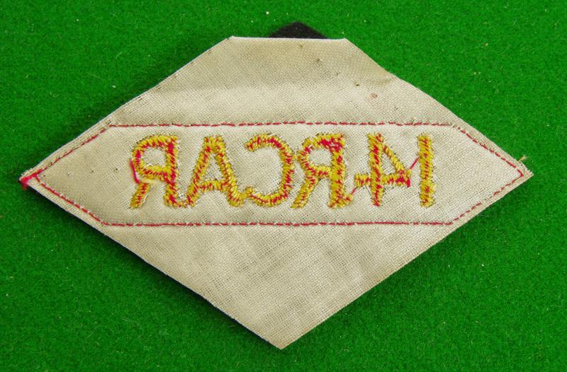 WW II embroidered example of the yellow title, " 14 RCAR" on a red bar to the centre of a black diamond. Worn by the 14th. Royal Canadian Armoured Regiment.