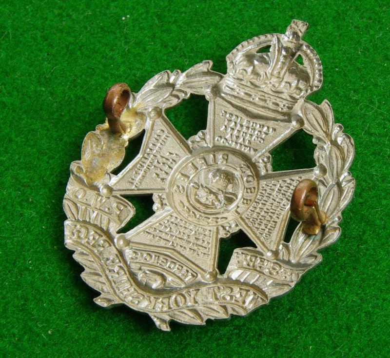 King's crown white metal cap badge with two loops to the reverse. A crowned bugle horn to the centre of a circlet bearing the subsidiary title, " Leeds Rifles" on a crowned maltese cross bearing battle honours within a wreath of laurel carrying the scrolls." 7th.8th.Bns.P.W.O. West Yorkshire Regt." and the unique honour, " Tardenois"