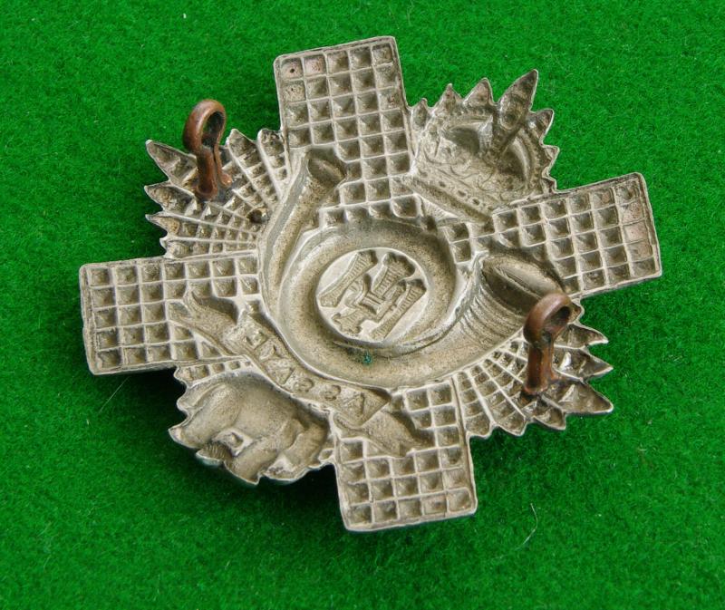 King's crown white metal glengarry badge with two loops to the reverse. The " HLI" monogram within a curled bugle horn above the honour scroll and the elephant, surmounted by the crown upon the Order of the Thistle.