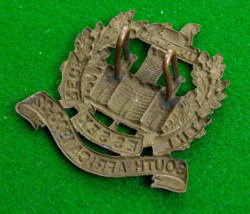 Rare black-brass slouch hat badge with two large loops to the reverse. The castle to the centre of a wreath of oak bearing " The Essex Regt." title above a large " South Africa 1900-02 " honour scroll surmounted by the Sphinx upon a tablet, " 1st.V.B" {worn only from 1905-1908}
