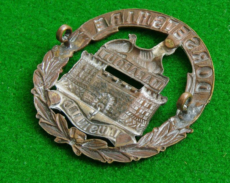 Victorian bi / metal cap badge with two loops to the reverse. The sphinx and " Marabout" honour above the two-tower castle and the motto scroll within an oval consisting of half laurel and half title, " Dorsetshire"
