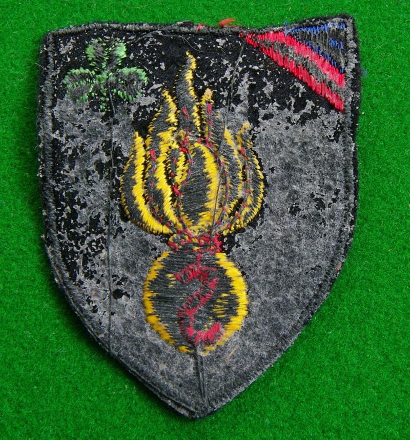 WW II embroidered example of the yellow fused grenade bearing the letter, "S " a green shamrock and a red and blue strip on a black shield. Worn by the 4th. {Steentraete} Belgian Infantry Brigade.