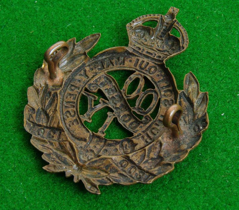 Very scarce king's crown bronzed cap badge with two loops to the reverse. The " Q O I Y " monogram and the scroll, " Dorset" to the centre of a crowned Garter Strap within a wreath of laurel that carries the South Africa honours.