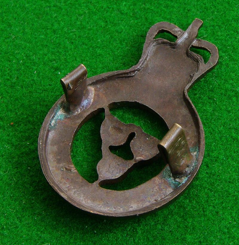 Scarce queen's crown officers bronze service dress cap badge with two blades {folded into loops} to the reverse. The three leopard's heads to the voided centre of a crowned circlet bearing the title.