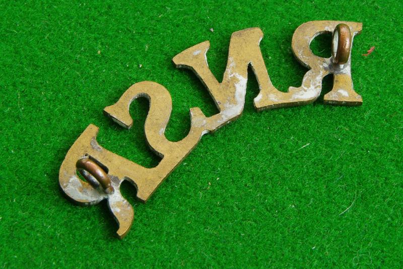 Very scare early pattern arc-shaped sheet brass shoulder title, " R N S R " worn by Royal Navy Scripture Readers.
