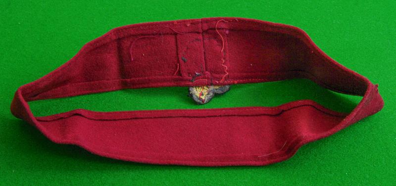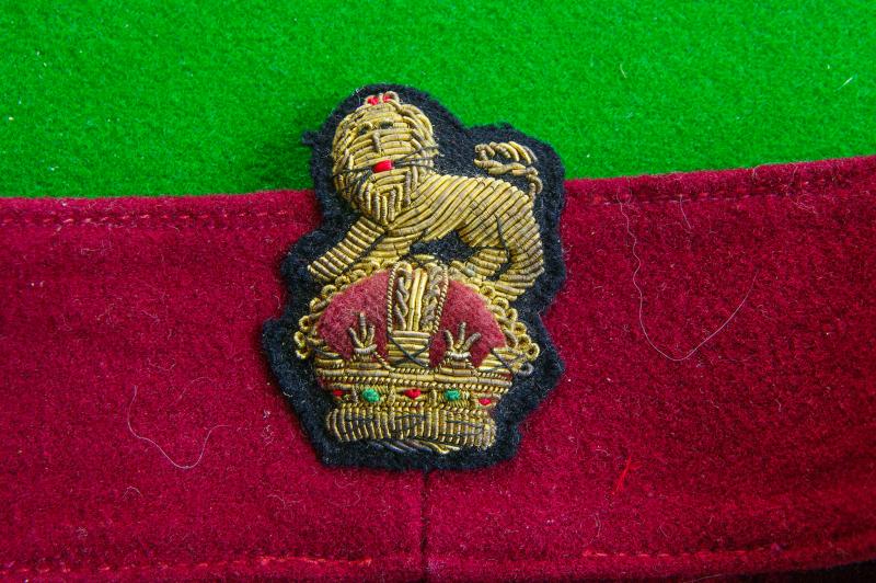 Scarce king's crown gold bullion wire R.A.M.C. Brigadier's cap badge still affixed to a maroon cap band. The Royal Crest with red velvet inset crown.