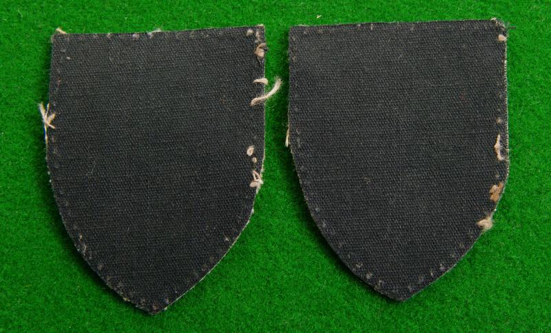 Pair of WW II printed formation signs depicting a white shield bearing a blue cross and a golden Crusader's Sword. Second Army was raised for the invasion of Europe and as part of 21st.Army Group landed in Normandy in June 1944.