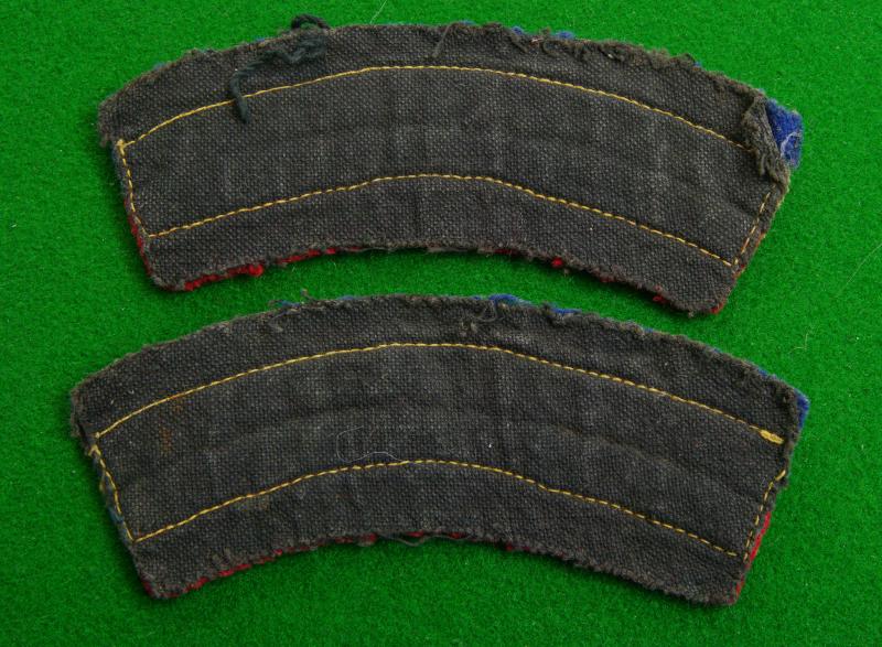 Pair of WW II embroidered in blue, yellow and red shoulder titles worn by the " Royal 22 Regiment"