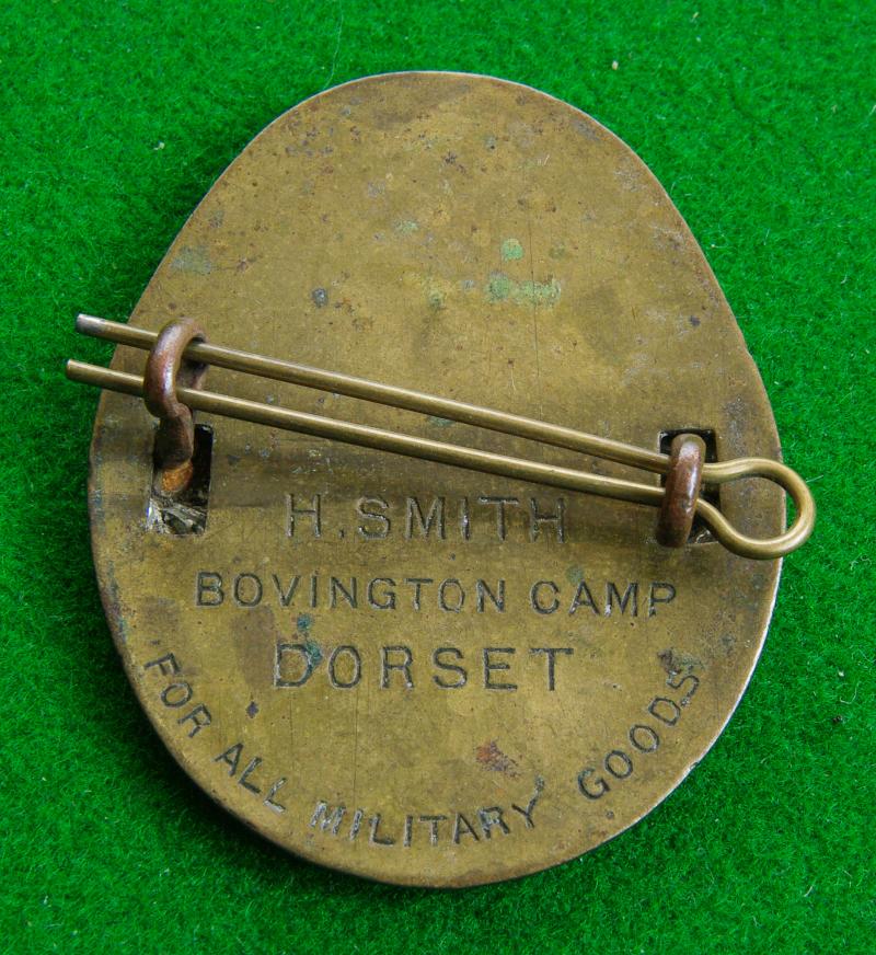 King's crown white metal cap badge with two loops and retailers brass back-plate to the reverse bearing details for " H. Smith Bovington Camp Dorset" A WW I style tank and the motto scroll to the centre of a crowned wreath of laurel.