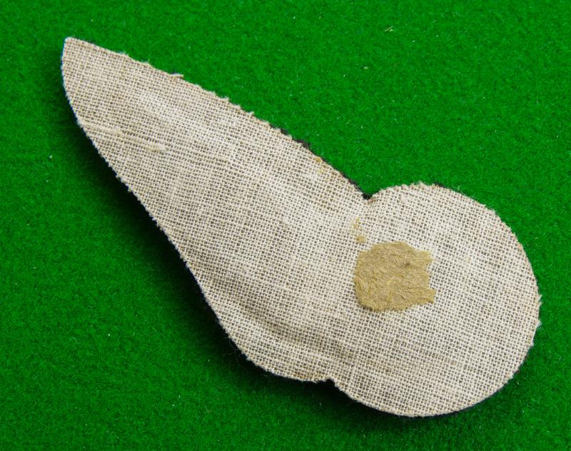 Scarce WW II embroidered and padded qualification half-wing worn by a " Wireless / Air-Gunner". An oatmeal coloured wing and brown laurel wreath with "WAG" to the centre on a shaped black backing. {Paper spot to the reverse}
