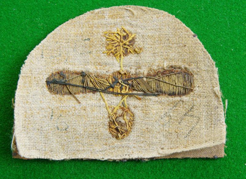 Gold bullion wire embroidered Leading Rating's " Air Mechanic {Ordnance}" sleeve badge. A star above a two-bladed propeller and the letter, "O" on a black tombstone shaped backing.