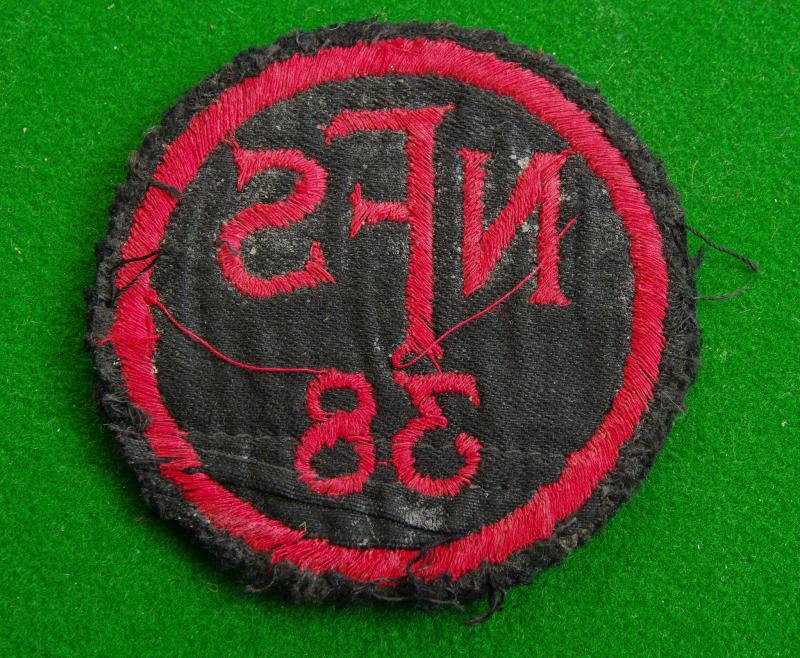 WW II example of the embroidered in red on black circular tunic / overall badge worn by firefighters from Wimbledon London. The NFS monogram above the number, " 38"