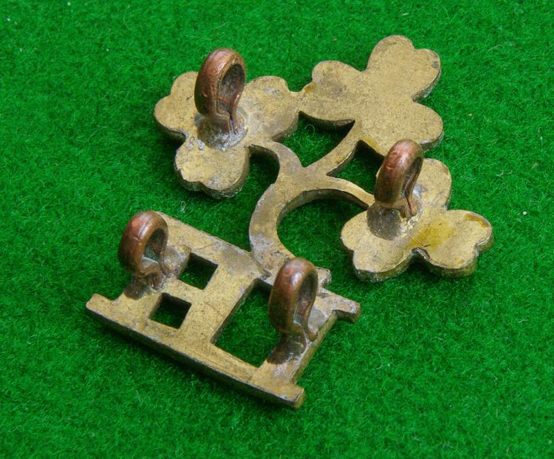 Scarce brass headdress badge with four loops to the reverse worn by the 29th. Battalion Irish Horse Imperial Yeomanry. A sprig of shamrock above the letters, " I.H."