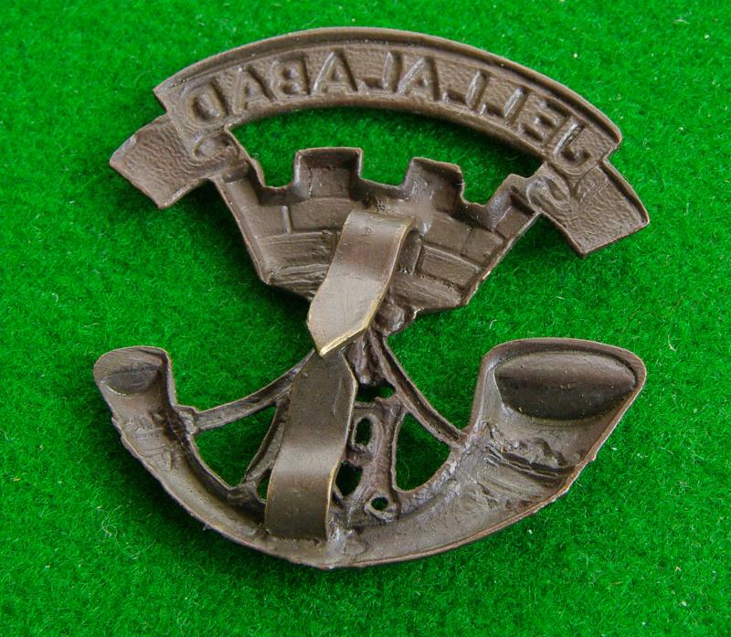 Officers bronze service dress cap badge with two blades to the reverse. The " PA" cypher between the strings of a bugle horn surmounted by the Mural Crown and the honour scroll, " Jellalabad"