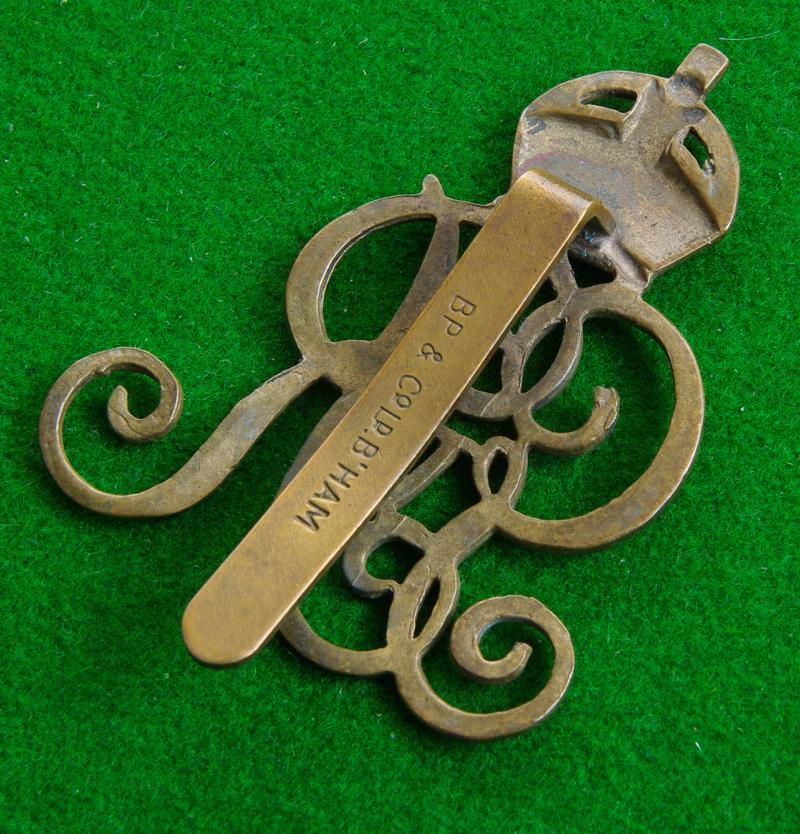 King's crown brass cap badge with slider fitting to the reverse bearing makers details for " B P & Co. Birmingham." The crowned cypher of GvR.