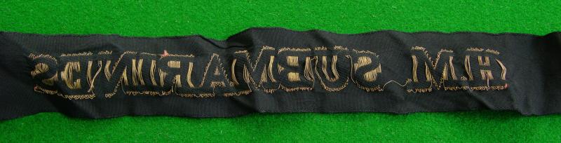 WW II gold bullion wire embroidered cap tally, " H.M. Submarines"