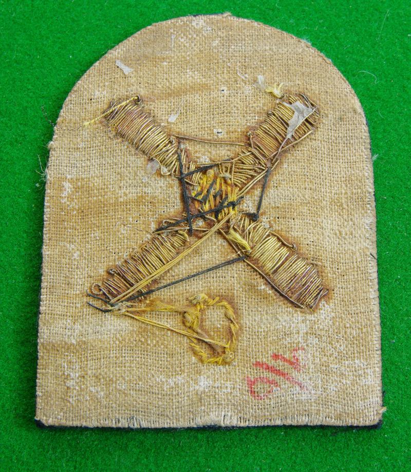 Gold bullion wire embroidered sleeve badge worn by an Air Fitter {Ordnance} below Leading Rating. A four-bladed propeller above the letter, "O" on a black tombstone shaped backing.