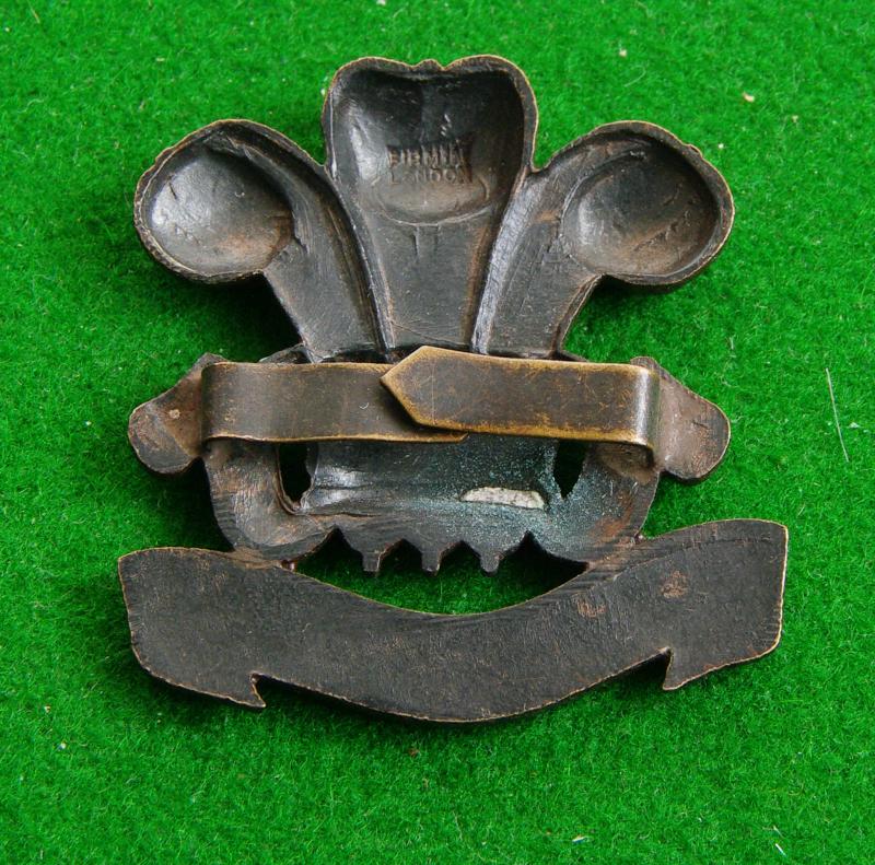 Officers bronze service dress cap badge with two blades and makers details for Firmin London to the reverse. The Prince of Wales's plumes above the title scroll, " The Welch"