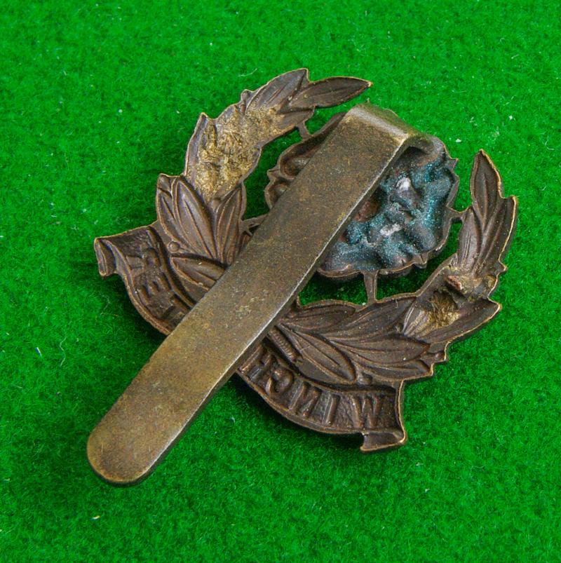 Bronze cap badge with slider fitting to the reverse. The Hampshire Rose to the centre of a wreath of laurel above the title scroll, "Winchester" {Officially converted from loops}