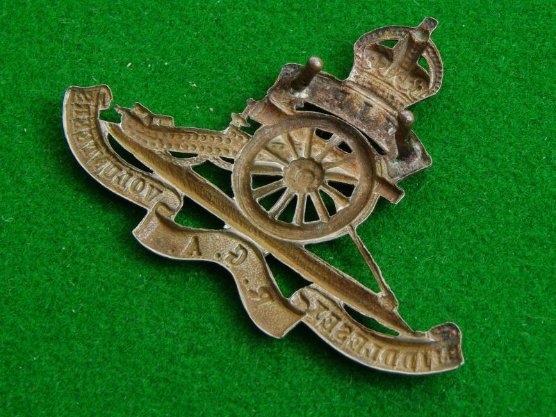 Scarce king's crown white metal cap badge with two loops {Squeezed in, removed from a display board} to the reverse. An old style field-gun above the tri-part title scroll, "Middlesex R.G.A. Volunteers" surmounted by the crown upon the title, " Third"