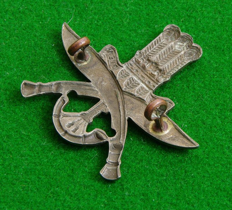 white metal headdress badge with two loops to the reverse. The prince of Wales's plumes above a pair of crossed kukris the number, "1" and a bugle horn.