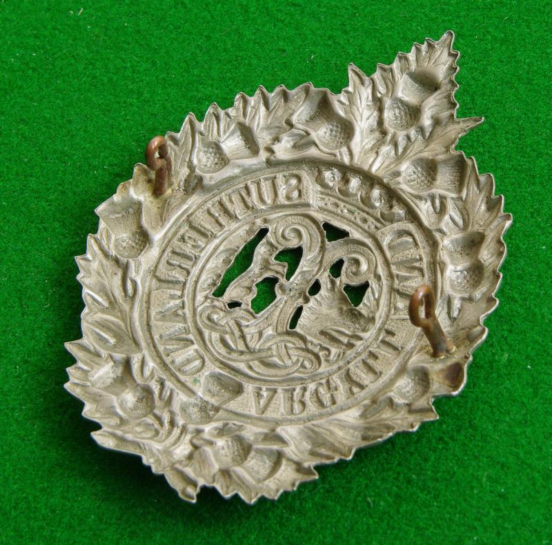 white metal glengarry badge with two long loops to the reverse. The cypher and Coronet of Princess Louise flanked by a boar's head and a cat to the centre of a circlet bearing the title within a wreath of thistle.