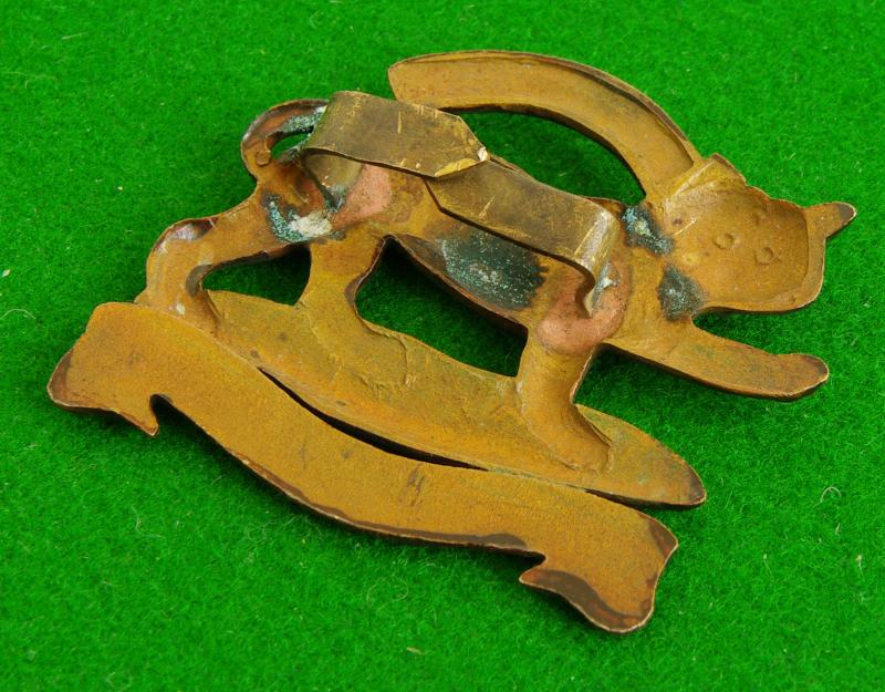Very unusual unrecorded? bronze officers cap badge with two blades to the reverse. The Royal Tiger standing on ground bearing the Regulars honour, " Hindoostan" in an arched scroll to its back above the title, " Uppingham"