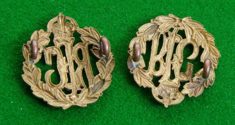 Pair of king's crown brass collar badges. The "RFC " monogram within a crowned wreath of laurel.