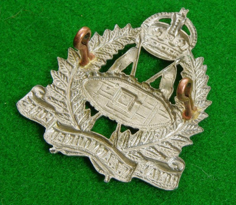 King's crown white metal cap badge with two loops to the reverse. A WWI style tank and a pair of crossed cavalry lances to the centre of a crowned wreath of fern above the tri-part furled title scroll.