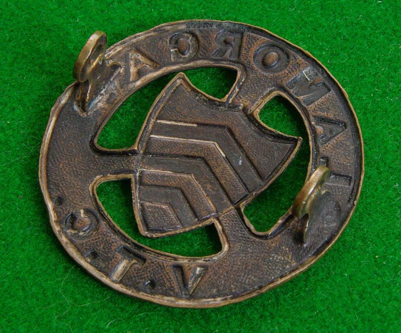 Scarce WW I bronzed cap badge with two flat lugs to the reverse. A shield bearing three chevrons to the centre of a circlet carrying the title, " Glamorgan V.T.C."