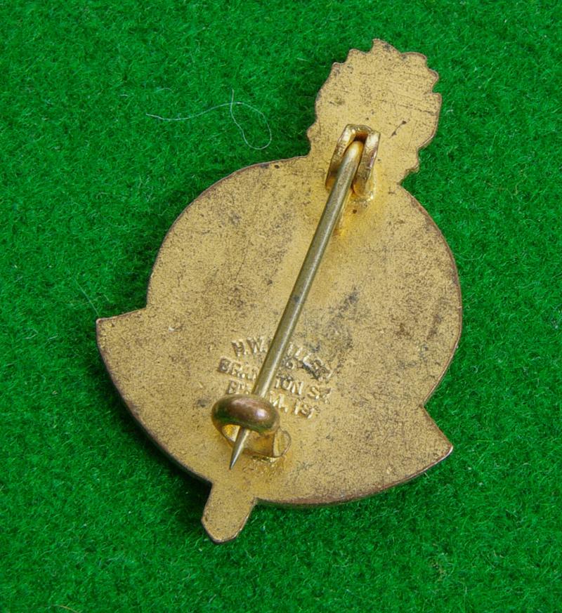 WW II brass and enamel lapel badge with brooch pin fitting and makers details for Miller Birmingham to the reverse. The " ARP" monogram on a blue enamel ground above the scroll, " Factory Service" backed by a red enamelled torch. {This was a generic pattern worn in many factories throughout the country.}
