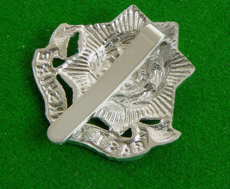 Scarce anodised aluminium cap badge with slider fitting to the reverse. The Yorkshire Rose within a wreath of laurel on a multi-rayed star above the furled title scroll, " East Yorkshire"
