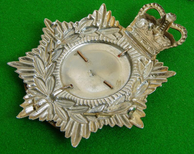Queen's crown bi / metal bandsman's helmet plate with three loops to the reverse. The Wessex Wyvern within a roped circle upon a maltese cross backed by red felt to the centre of a Garter Strap within a wreath of laurel that carries the double title scrolls, " The Duke of Edinburgh's Royal Regiment " and " {Berkshire and Wiltshire} upon a multi-rayed star plate. {Orb absent from tip of crown}
