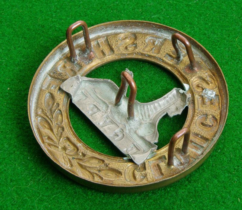 Bi / metal Home Service helmet plate centre with four loops to the reverse. The sphinx and Egypt honour to the centre of a circlet bearing the title, " Gloucestershire". Designed to be worn with the universal pattern other ranks helmet plate.