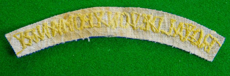 Scarce WW II embroidered in yellow on blue shoulder title, " Royal Devon Yeomanry"